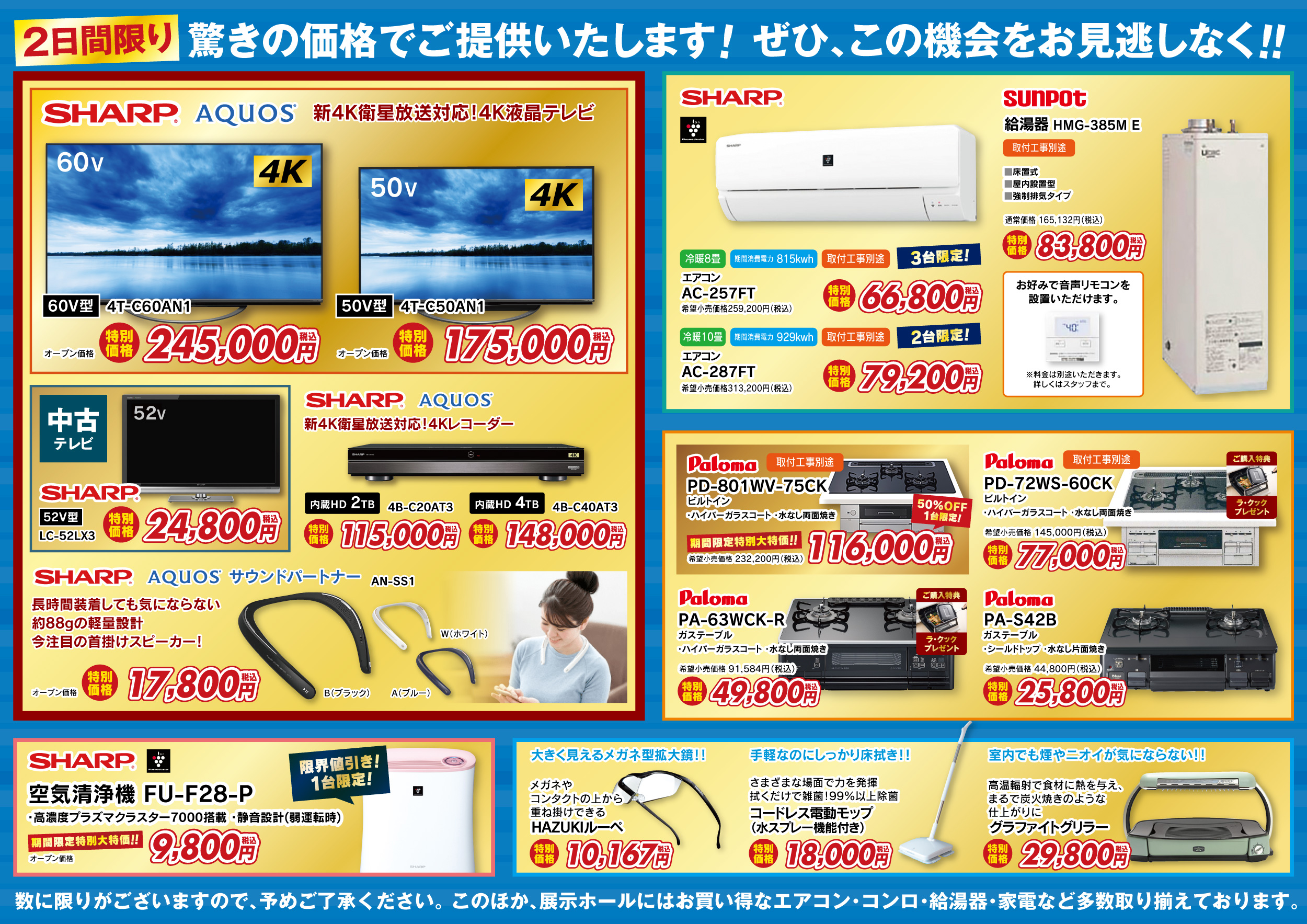 エアコンや空気清浄機をはじめ、シャープ製大型4Kテレビ、パロマのガステーブルなど、大型値引き商品を大奉仕!!